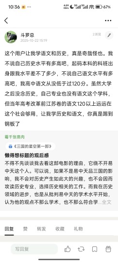 这个影片已经不能用闹心来形容了,影片本身内容差到极致,这一点我在之前的影评里已经详细说明了,这个片子的部分粉丝也是极度不可理喻,评论一句质疑就被用恶言辱骂,辱骂完了之后我被迫反击,他反而成受害者了,真是高,高啊!被骂的人成了加害者,骂人者成了受害者,这本来这影片就是0.5分的影片,现在好感完全败光,0.5分可以四舍五入成0分了!一个自称历史专业的人写的影评里一众标准中权重最低的居然就是历史,情怀占了绝大多数,任何正常人都会质疑,质疑的结果就是从第一句开始就是用脏话谩骂,是可忍孰不可忍?还自称是捍卫自己自由评分的权利,还能拔高到如此程度,你的评论区容不得不同声音就是容不得呗,只发了一句评论就能用脏话辱骂,居然还能弄上看似高尚的理由了。最让人无法理解的就是,我明明一开始只发了一句对他明明褒的部分很少,贬的很多,就质疑这么一句他就骂人,那我当然不干了,最后就话赶话发了40多条评论,但问题是,你一开始能说你是捍卫你自由评分的权利吗?如果不是你不断辱骂,会变成40多条评论吗?会构成现在所谓的对你评分的干涉的表象吗?说到底就是你在干涉我自由评论的权利,并进行网络暴力导致的。另外建议,口才这么好可以用到正道上。 你除了拿法律恐吓还会啥?但问题是这恰恰暴露你对法律一无所知。 来看看我之前转发的文案: